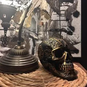 Enhance your space with this striking black and gold skull accent. Perfect for adding a touch of mystery and elegance to any room.