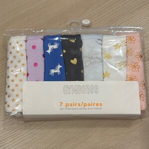 Set of 7 girls' underwear. NWT. Features fun patterns and colors. Includes stars, unicorns, and hearts.