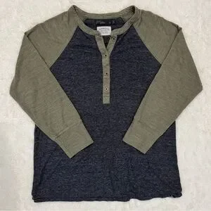 Casual Henley style shirt with olive raglan sleeves and heather charcoal body. Features a button-up front. Thin lightweight fabric and some light pilling (see photos). Pre owned condition.