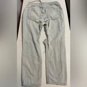 These very distressed light wash boyfriend jeans with drawstring waist are super lightweight and comfortable. Size medium with 26” inseam (OT-5)