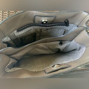 Brighton Dark Sable Gray/Brown/Pewter Pebble Leather Shoulder Bag! Thick Pebbled Leather with Leather Stitched Accents, Dangle Leather Straps with Logo Heart & Front Charm, Back Pocket w/Magnetic Catch, Interior has Magnetic Catch as well, Lots of Interior Storage Space, Adjustable Shoulder Strap and in Excellent, Like New Condition. Measurements: Width 11.5" x Height 10" x Depth 4.5".