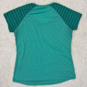 Pre owned condition. Chic aqua striped tee with short sleeves. Soft and comfortable for everyday wear. Ideal for casual style.