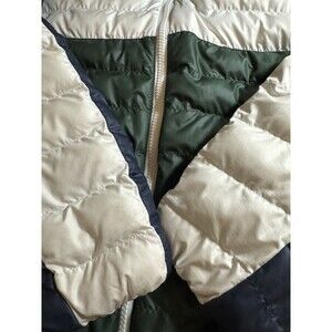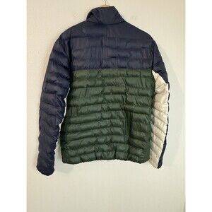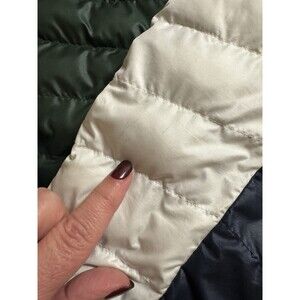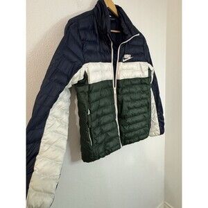The Nike Bubble Puffer Nylon Jacket Coat in Medium size for men is a mid-length color block/striped jacket featuring a dark green, white, and navy blue color scheme. Made of durable nylon with a softshell fabric type, it is suitable for travel, casual wear, and workwear occasions. The jacket has a zip closure and provides insulation with polyester material, making it ideal for winter, fall, and spring seasons. It also includes zipped pockets and other features, perfect for activities like gym training, soccer, and basketball. The Nike Bubble Puffer Jacket combines style and functionality, showcasing a vintage style design. Jacket is in great preowned condition with no holes or major flies. There is some very light staining on the white portion of the arms, but it is very minor and largely unnoticeable. See photos. Item has been washed cleaned and sanitized. Measurements are in photos. I appreciate your business and strive for five star rating. Please feel free to message with questions