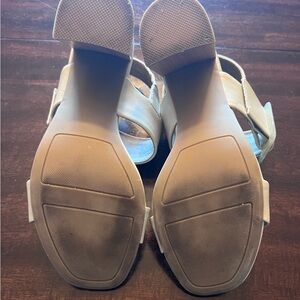 Chic cream sandals with a stylish block heel. Features a unique buckle design. Perfect for any occasion. Wore one time for a wedding. Slight scuff on inside left strap as seen in pictures.