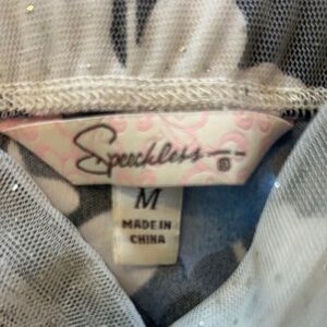Elegant mini dress with navy and white floral design. Features a sheer overlay with delicate floral patterns. Perfect for special occasions.