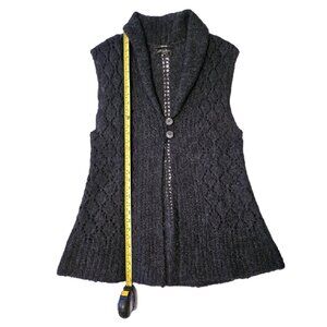 Charcoal grey Eddie Bauer hand knit mohair blend vest. Features an intricate, open-work diamond/lattice knit pattern. Two large button closure. Very soft texture.