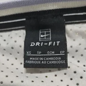 Nike Dri-FIT top in white with black accents. Breathable and stylish.