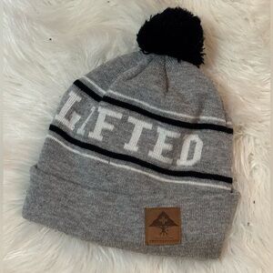 Stylish gray beanie with a playful black pom. Features bold LRG branding. Perfect for cool weather.