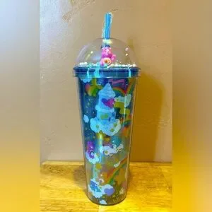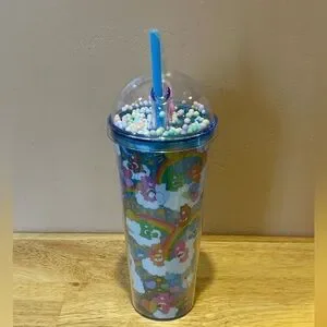 This is THE MOST ADORABLE Care Bears tumbler with twist on lid and straw. Blue background with images of Care Bears, hearts, rainbows and stars. The lid features a dome with a CareBear figure and confetti inside. Made By Silver Buffalo. Brand new with tags.