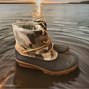 Sperry Camouflage and Brown Duck Rain Boots Sz 6