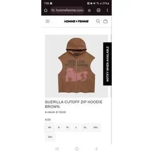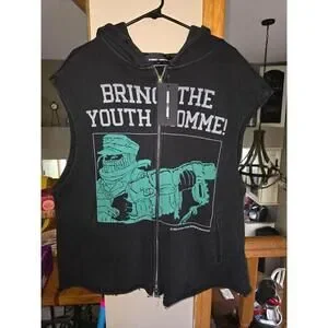 100% cotton french terry hoodie with cutoff sleeves, front zipper and screen print graphic.