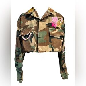 Upcycled Women's Woodland Fatigue Camo Cropped Jacket Top Valentine’s Patches