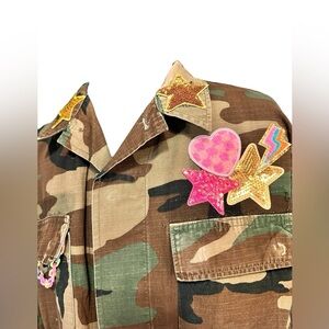 This upcycled women's woodland fatigue camo cropped jacket top features Valentine's patches, making it a unique and colorful addition to your wardrobe. Made from 100% cotton, this short-length jacket has a button closure and a casual style. The camouflage pattern adds a touch of edginess, while the size S and regular fit ensure a comfortable and stylish look. Perfect for adding a fun and trendy element to your outfit, this jacket is a one-of-a-kind piece that showcases a creative and playful design aesthetic.