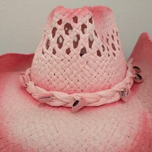 The product is a vintage coastal women's cowboy hat in a pink tea stain color, not your average cowgirl hat. this hat is made of straw with shell accents to add a coastal island flare. With its unique style and one-size fit, this cowgirl hat adds a touch of fun and flair to any outfit. Ideal for those who appreciate retro fashion and a touch of wild west charm.