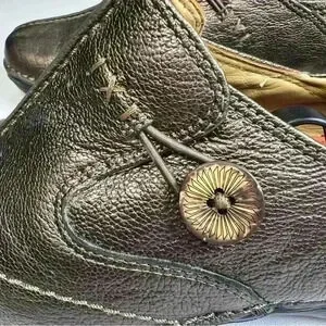 Slip-on casual shoe featuring split-toe seam, topstitching details, and decorative wooden button with elastic toggle