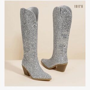 Step out in style with these dazzling silver glitter boots. Perfect for adding a touch of sparkle to any outfit.