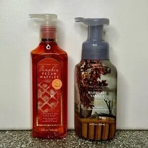 Bath & Body Works New Release Fall Holiday Scent Hand Soaps. Pumpkin Pecan Waffles & Mahogany Vanilla. Gentle & clean foaming & gel hand soaps. New.