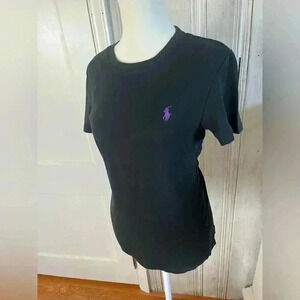 This classic and preppy tee shirt from Lauren Ralph Lauren is a must-have for any wardrobe. The shirt features a crew neckline and short sleeves, making it perfect for any season. The black color and purple embroidered polo logo add a touch of sophistication to the shirt, while the cotton material ensures comfort and durability. Thicker cotton material well made t shirt
