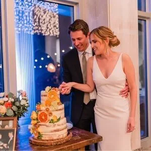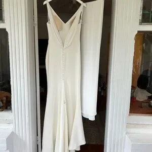 Selling my Made With Love “Harry” gown — a stunning, modern wedding dress in ivory French crepe. The dress features a 3 cm higher neckline and detachable train, giving it both elegance and versatility.