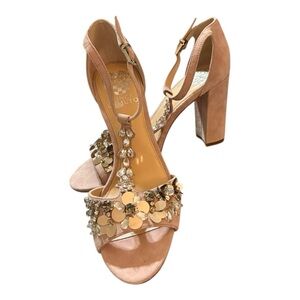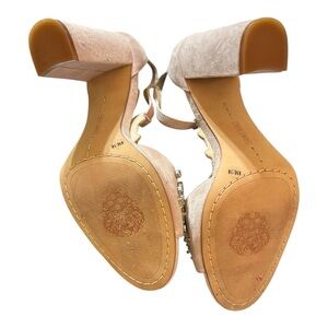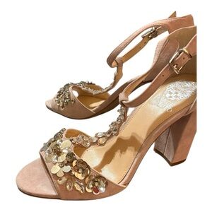 women's pink suede heels by Vince Camuto, adorned with floral and jewel embellishments. These heels feature an open-toe design, a t-strap, and a block heel.