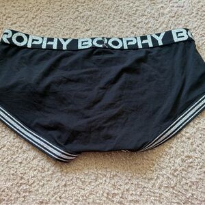 Black briefs with bold 'Trophy Boy' waistband. Sleek and tagless design.