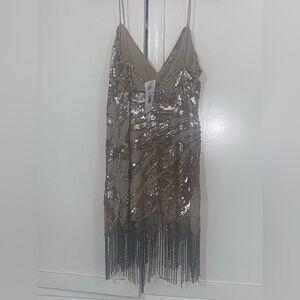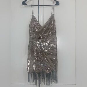 Dazzle in this metallic mini dress. Features shimmering sequins and playful fringe. Perfect for a night out.