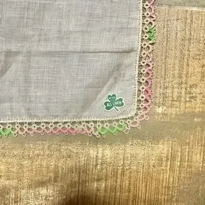 Delicate vintage all-linen handkerchief with colorful pink, green, and cream tatted lace edging. Original shamrock “All Linen” label still intact.