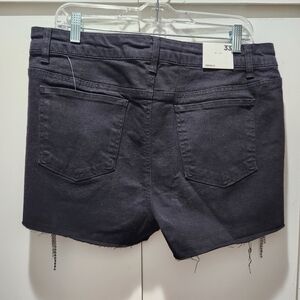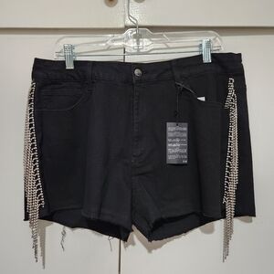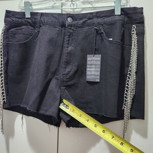 Elevate your style with these glamorous black jean shorts, featuring dazzling silver accents. Perfect for a chic and trendy look.