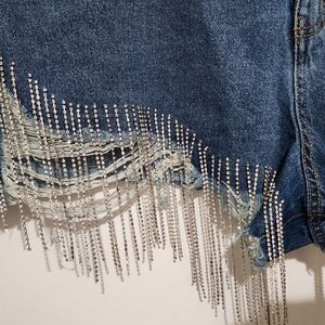 Stylish denim distressed shorts with fringe rhinestone detail. Beaded accents add flair. Ideal for festivals or concerts.