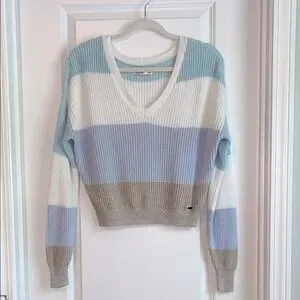 Hollister Striped Cropped V-Neck Sweater, size Small. Light blue, white, lavender and beige stripes.
