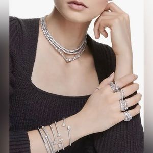 It combines the brilliant pairing of clear round stones with a silver-tone finish, giving you a look that is timeless and luxurious. Designed to shine on all sides, you can stack this jewelry with other styles, such as an eye-catching cocktail ring for an effective contrast.
