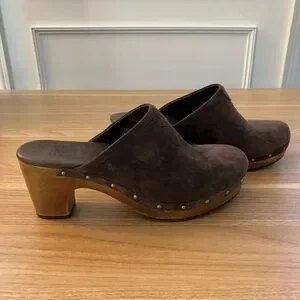 Elegant chocolate suede clogs with wooden platform. Perfect for casual outings.