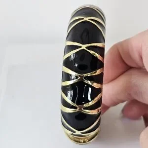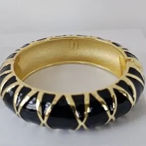 This is a stunning piece designed by Kenneth Jay Lane. It has black enamel and gold wash stripes. It closes easily and fits more wrists. Measures 1.5" wide. Oval opening fits up to 8" wrist. It is stamped by the designer. In like new condition. It has been lovingly cared for.
