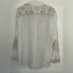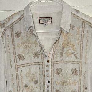 Johnny Was white button up shirt with tan embroidery. Lightweight, women’s M.