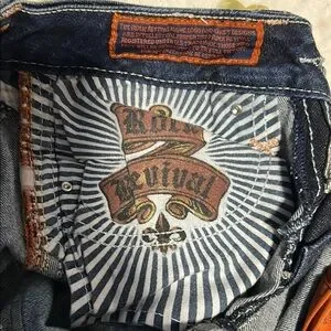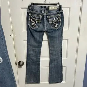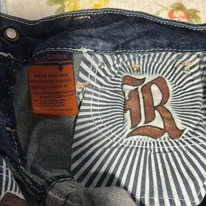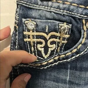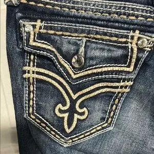 Stylish blue denim jeans with white stitching. Features Rock Revival branding on the waistband.