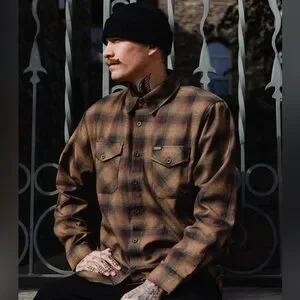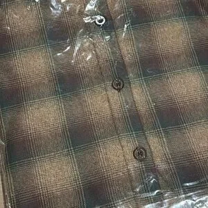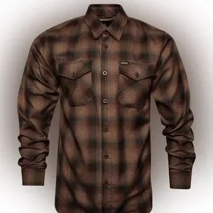 Men’s brown, khaki, and green plaid flannel shirt from Dixxon.