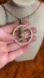 This is a rose gold-tone pendant necklace by Charming Charlie. The pendant is a circular, open-work design featuring a stylized pattern and is embellished with small cream/tan colored rhinestones.  The necklace has a delicate, multi-strand chain and a lobster clasp closure