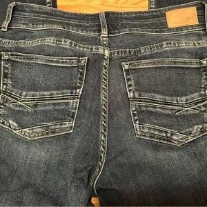 Dark blue denim with contrast stitching. Curvy fit and bootcut style.