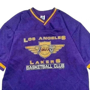 Vintage Los Angeles Lakers mesh jersey shirt. Purple and yellow. Made in USA. Logo 7.