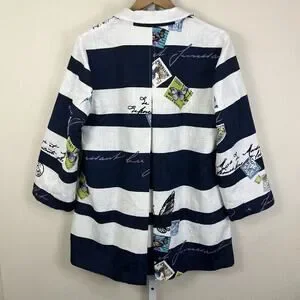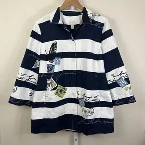 NWT CHICO'S Postcard Striped Jacket Size 2/L Large Stamp Navy Blue White Pockets