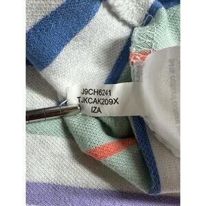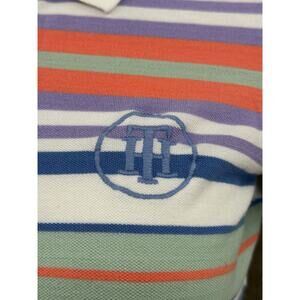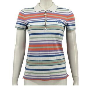 Tommy Hilfiger Top Womens XS White Multi Stripe Polo 1/4 Zip Cotton Stretch Sheer Pullover Short Sleeves Preppy Country Club Embroidered Crest Logo