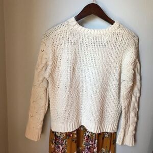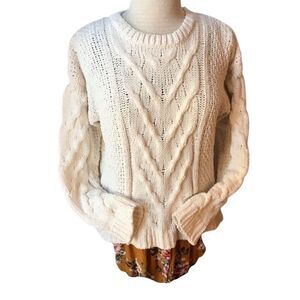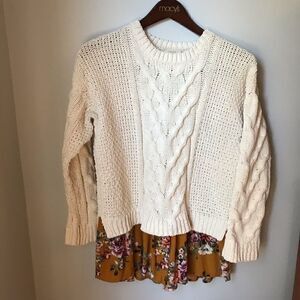 Oddy Cable Knit Sweater with handkerchief mustard floral hem. S/M. Long, cabled sleeves, crew neck. Lagenlook - mixed material. Hem is attached to vented bottom hem. So interesting and different. Pretty and cozy! #fishermancore #lagenlook #irishknit