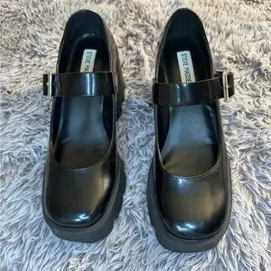 Elevate your look with these glossy black platforms. Sleek design with a bold buckle strap.