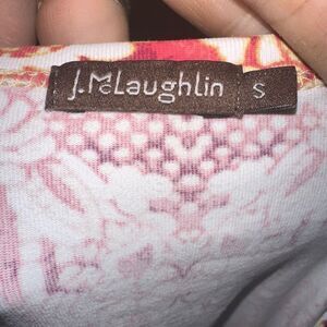 J McLaughlin floral, resortwear, scoop neck, stretchy, long sleeve, knit, vacationcore top. Pairs well with jeans or shorts. Approximately 18 inches from armpit to armpit, 23 inches long. In good, used condition. From a pet and smoke free house.