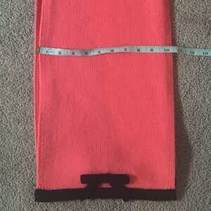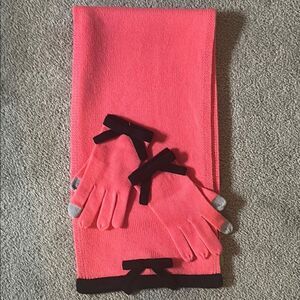 Stylish pink scarf and gloves set. Features elegant black bow accents. Perfect for adding a pop of color to any outfit!