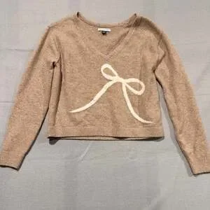 American Eagle Tan V-Neck Sweater with Bow Detail