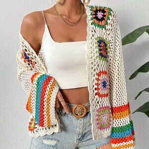 Multicolor Casual Womens Braided Hollow Out Holiday Long Sleeve Open Cardigan