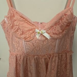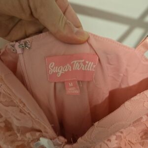Sugar Thrillz pink lace dress. Corset like upper portion and zip up back. Baby pink color with bow detail. Women's medium.