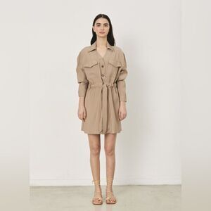 Rayon blend button down shirt mini dress with lapel collar and long sleeves with buttoned cuffs. V-neckline. Adjustable waist with front ties and elastic at the back. Front patch pockets with flap. Front button closure