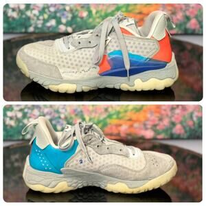 Good to fair used condition men's Nike DJ9843-004 Air Jordan Delta 2 Sneaker Size 11 in Light Pumice/Pure Platinum-Racer Blue-Crimson. Overall good condition with some staining and wear inside and out.